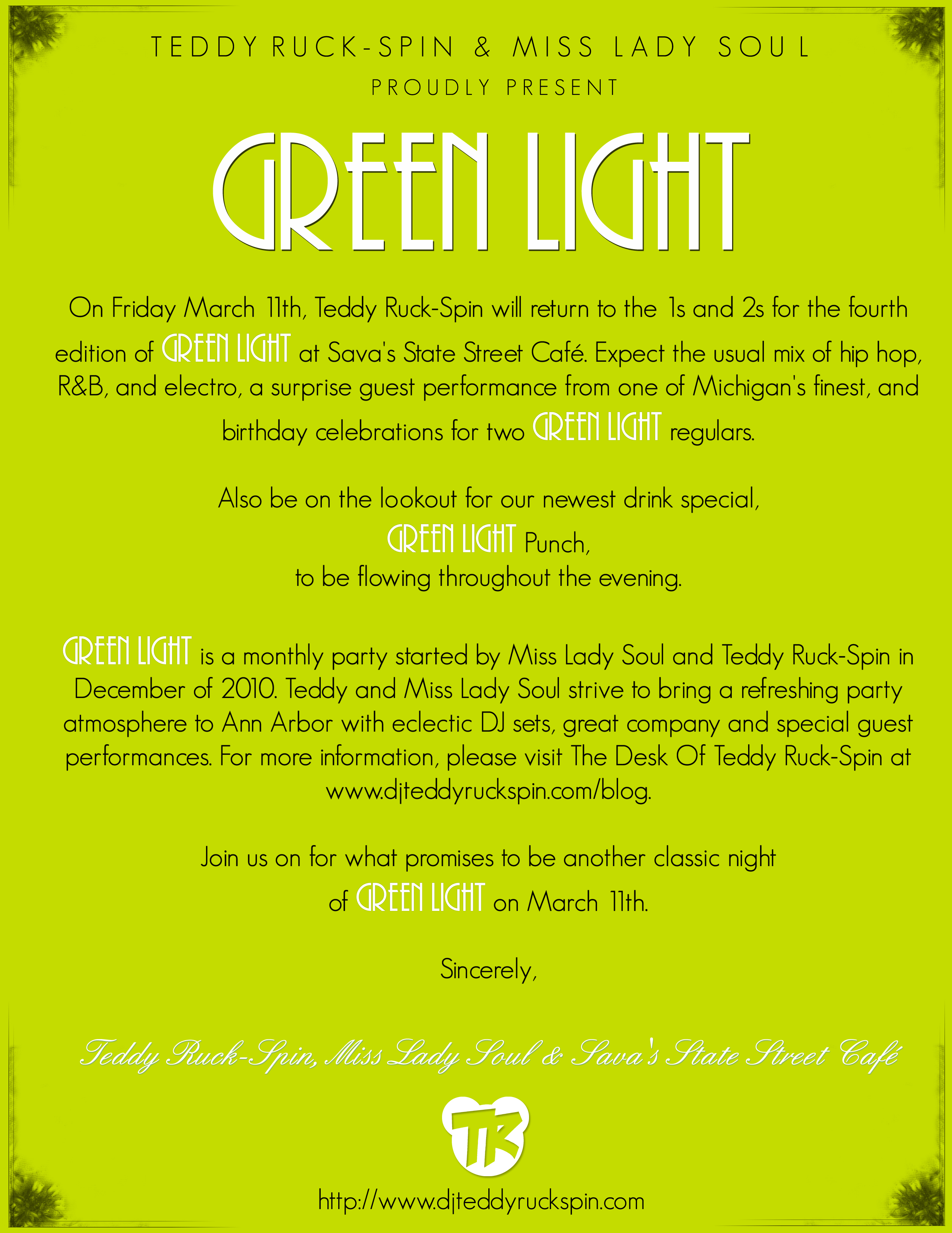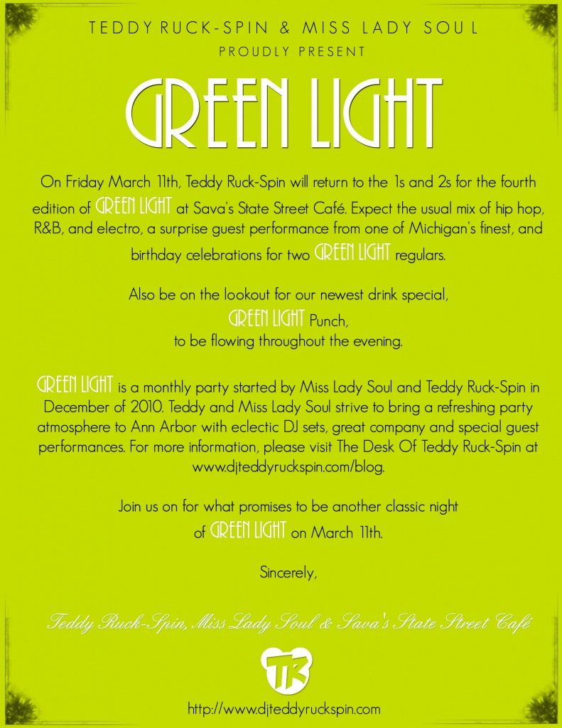 3/11 – Green Light: Presented by Teddy Ruck-Spin & Miss Lady Soul x Sava’s (Ann Arbor)